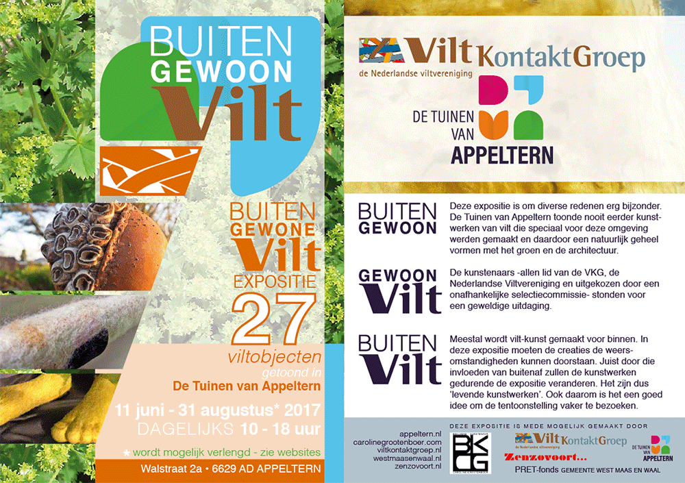 Voor de ViltKontaktGroep heb ik in 2017 een buitengewone expositie in De Tuinen van Appeltern geëxposeerd en de expositie georganiseerd. 27 Vilters hebben kunstwerken voor buiten in de tuinen gerealiseerd. Interessant te ontdekken hoe vilt zich in weer en wind houdt. De expositie was te bezichtigen van juni t/m september.