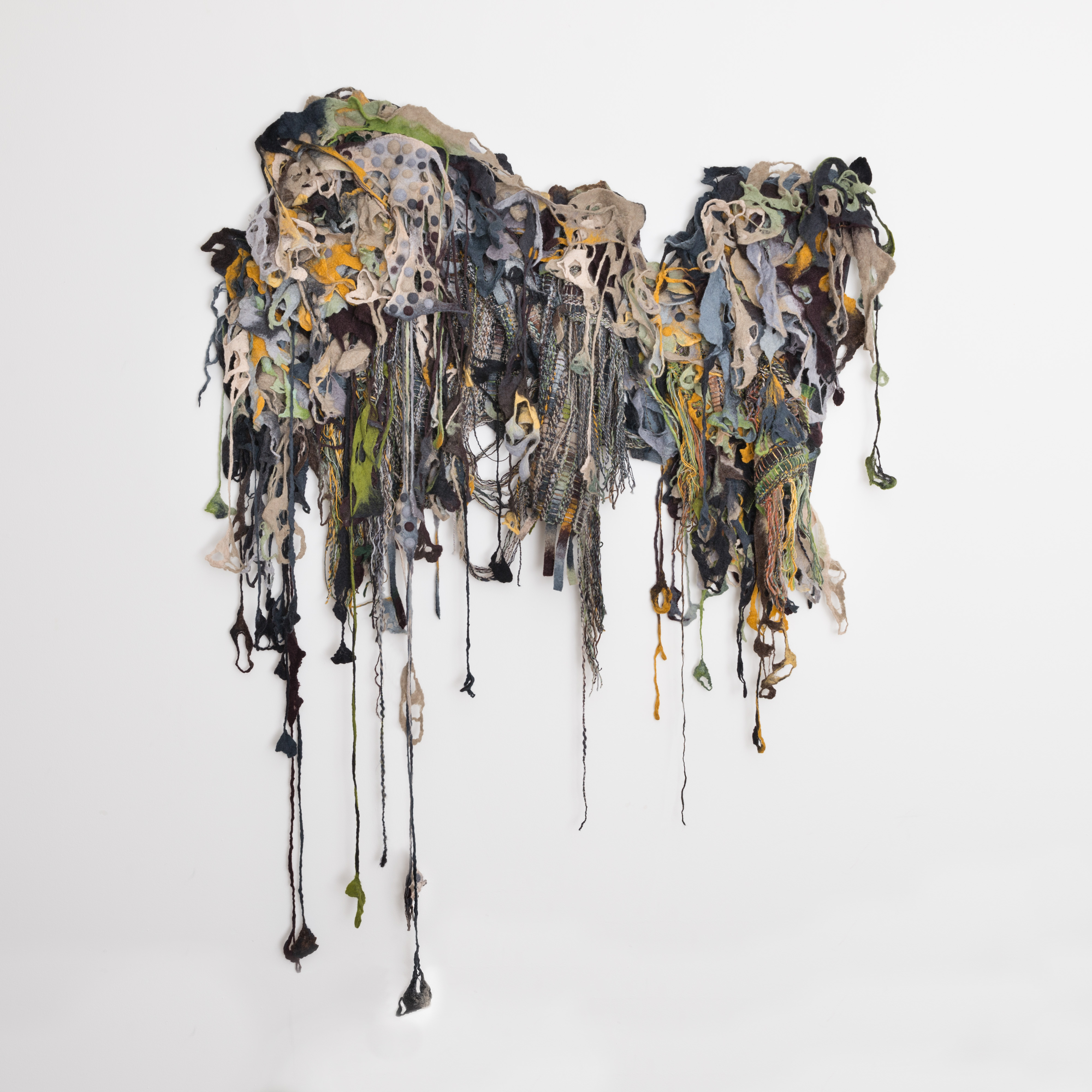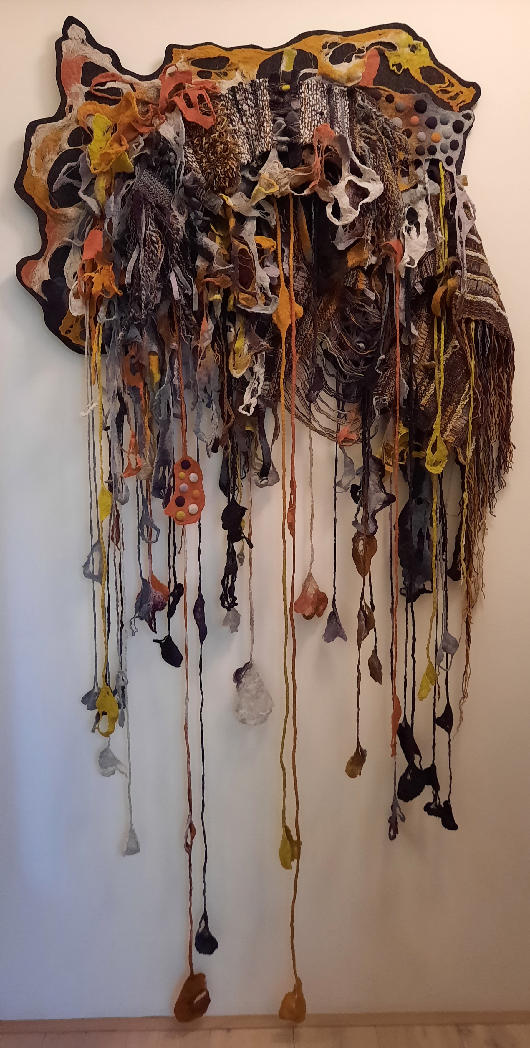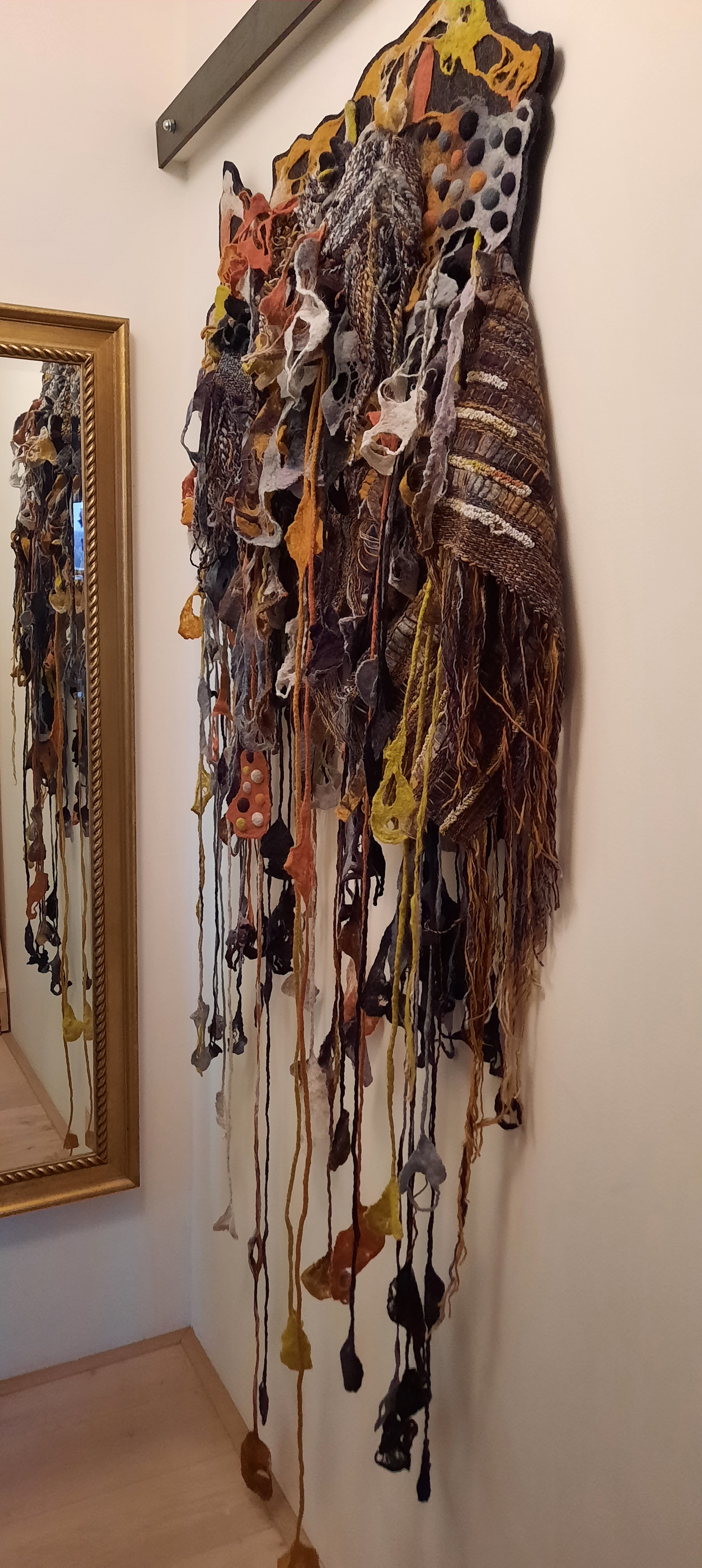 Jaren geleden zagen we voor het eerst het Changeble Art-werk van Caroline. Meteen verkocht. Met grote kennis van een breed scala van textiele technieken, bouwt ze haar werk vanaf de basis (lontwol) op tot een unieke collage. Wij hadden en lastige plek uitgezocht voor het toekomstige kunstwerk: aan het einde van een smalle gang, met weinig licht.